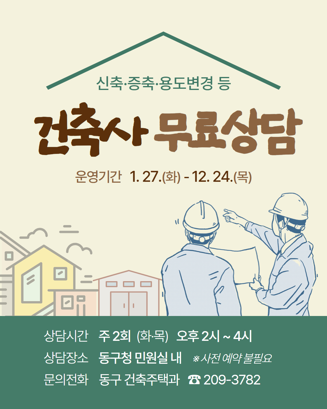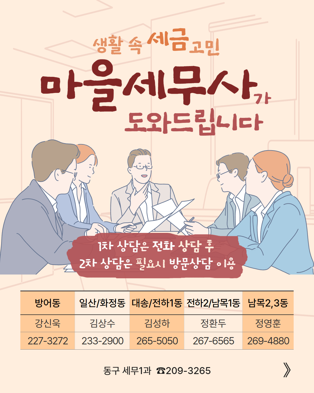 이미지 확대보기 이미지 확대보기 이미지 확대보기 이전 다음 제 목 법률 세무 건축 무료상담 등 록 일 2026-02-03 내 용 무료법률상담: 사전예약제, 선착순 상담, 문의 209-3052 마을세무사상담: 1차 전화상담 / 2차 필요시 방문상담, 문의 209-3265 건축사 무료상담: 주2회(화,목) 오후 2시~4시, 문의 209-3782 목록