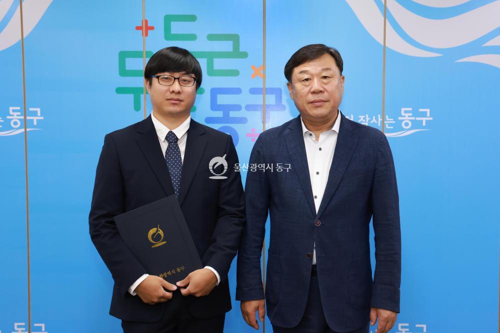 - 사진설명 김종훈 동구청장은 28일 구청장실에서 신규 임용자를 대상으로 임용장 수여 및 축하 기념촬영을 하고 있다.