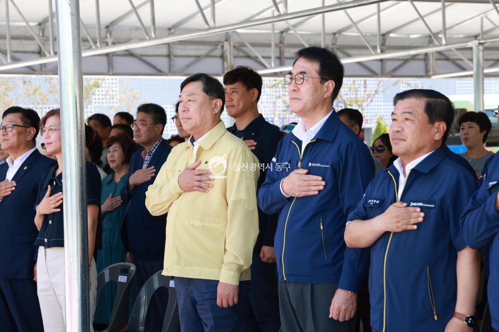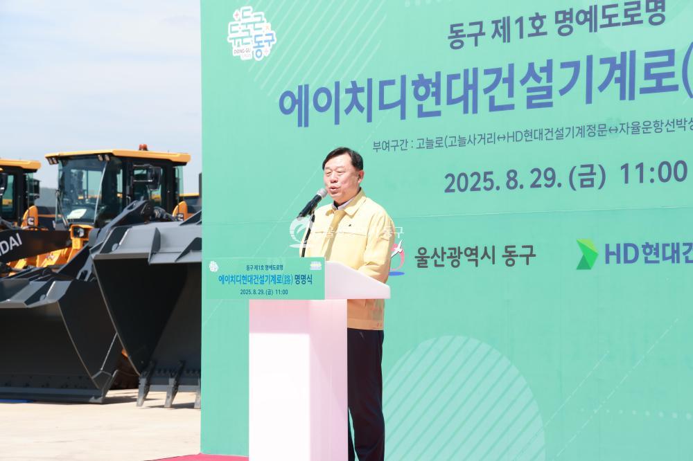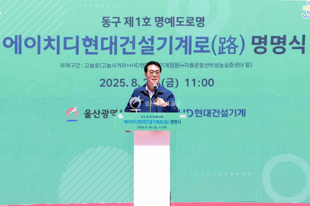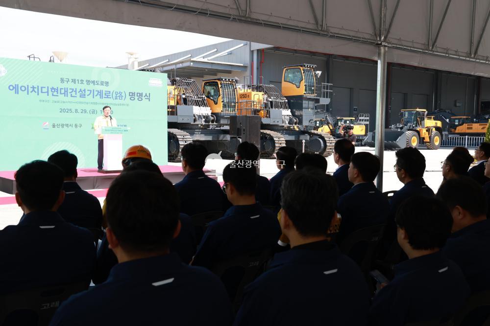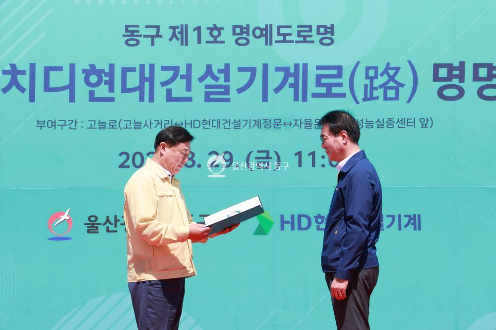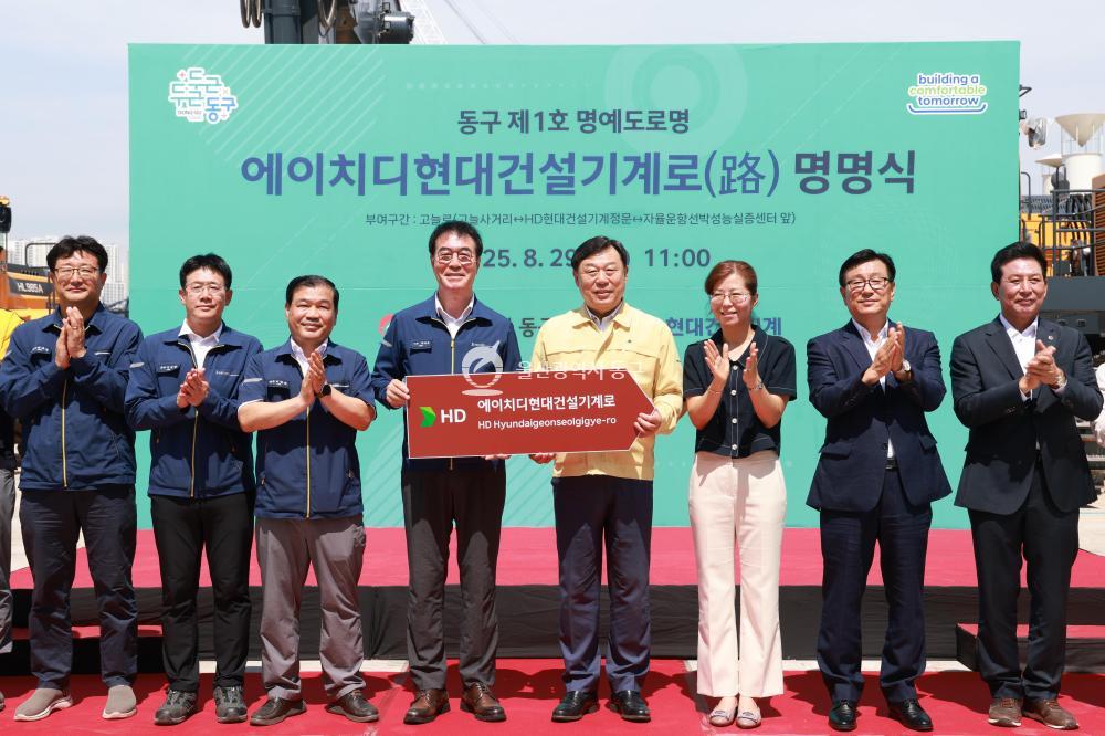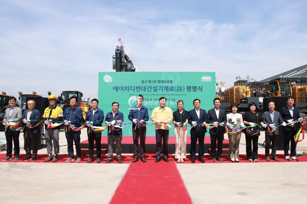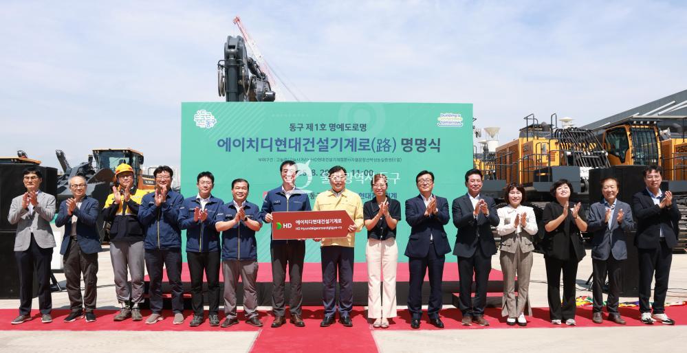 - 사진설명 동구는 29일 HD현대건설기계 일원에서 김종훈 동구청장과 최철곤 대표이사 등이 참석해 고늘로 구간에 명예도로명 ‘에이치디현대건설기계로’ 명명식을 갖고 증서 전달 및 축하 테이프 커팅식을 했다.