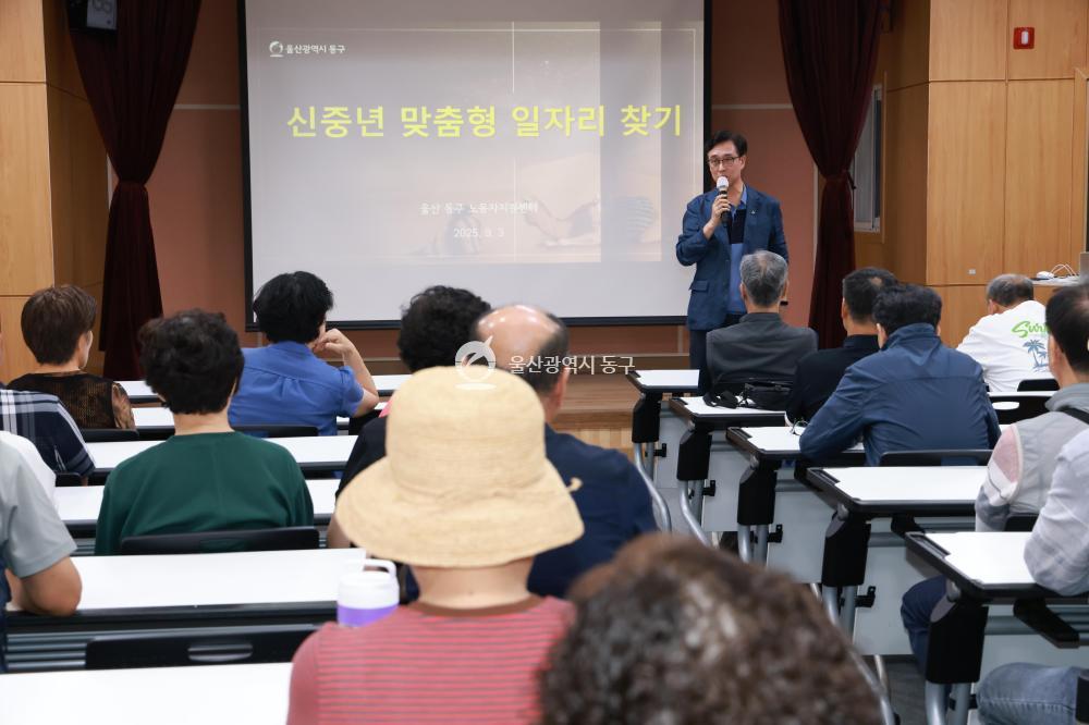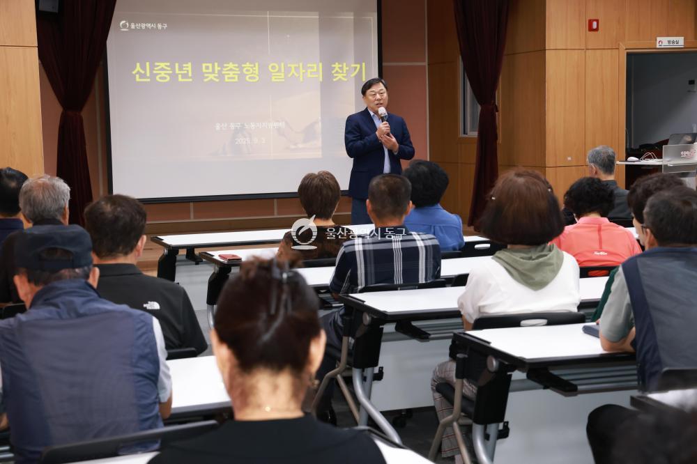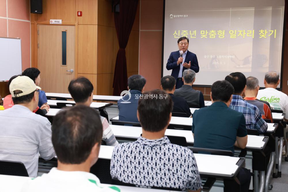- 사진설명 동구 노동자지원센터는 3일 센터 강당에서 지역 주민 50여명을 대상으로 ‘신중년 맞춤형 일자리 찾기’ 특강을 개최한 가운데 김종훈 동구청장이 참석해 인사말을 하고 있다.