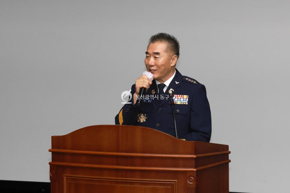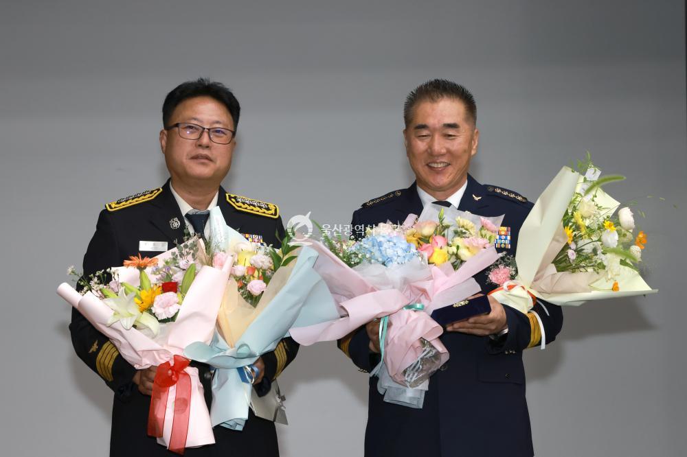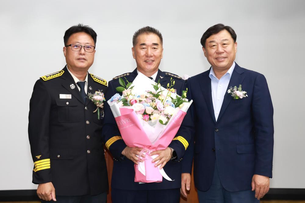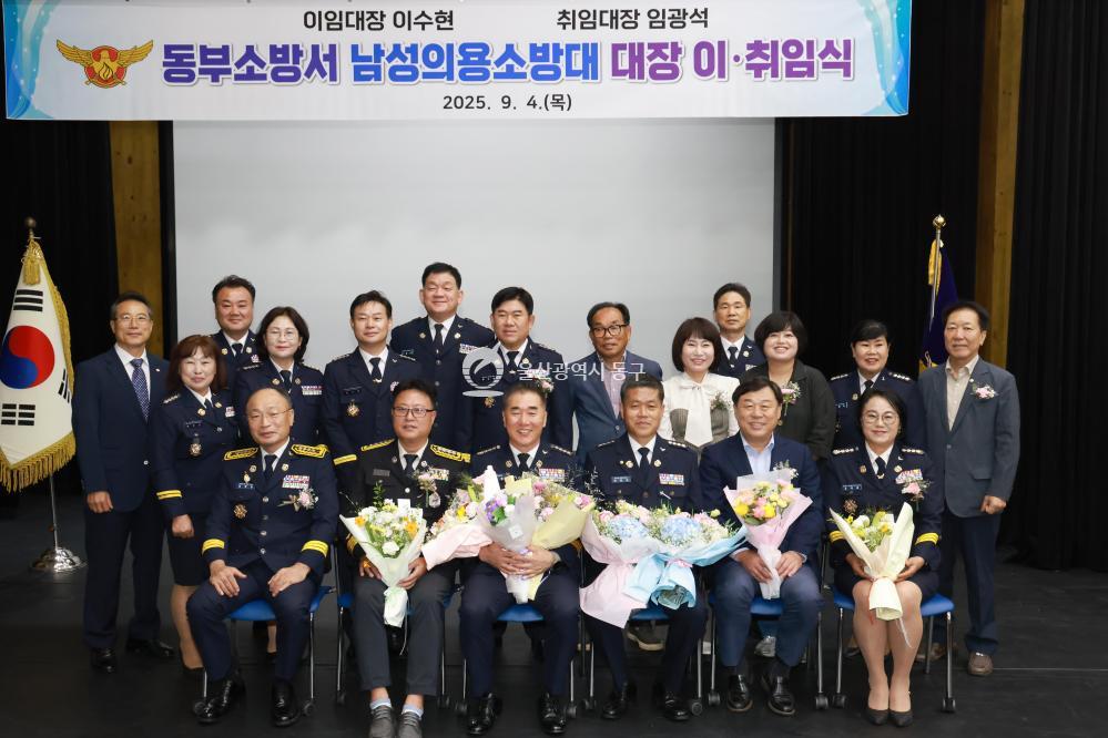 - 사진설명 동부소방서 의용소방대는 4일 꽃바위문화관에서 남성의용소방대장 이취임식(취임 임광석, 이임 이수현)을 개최하고 김종훈 동구청장 및 동부소방서장 등이 참석해 축하 기념촬영을 하고 있다.
