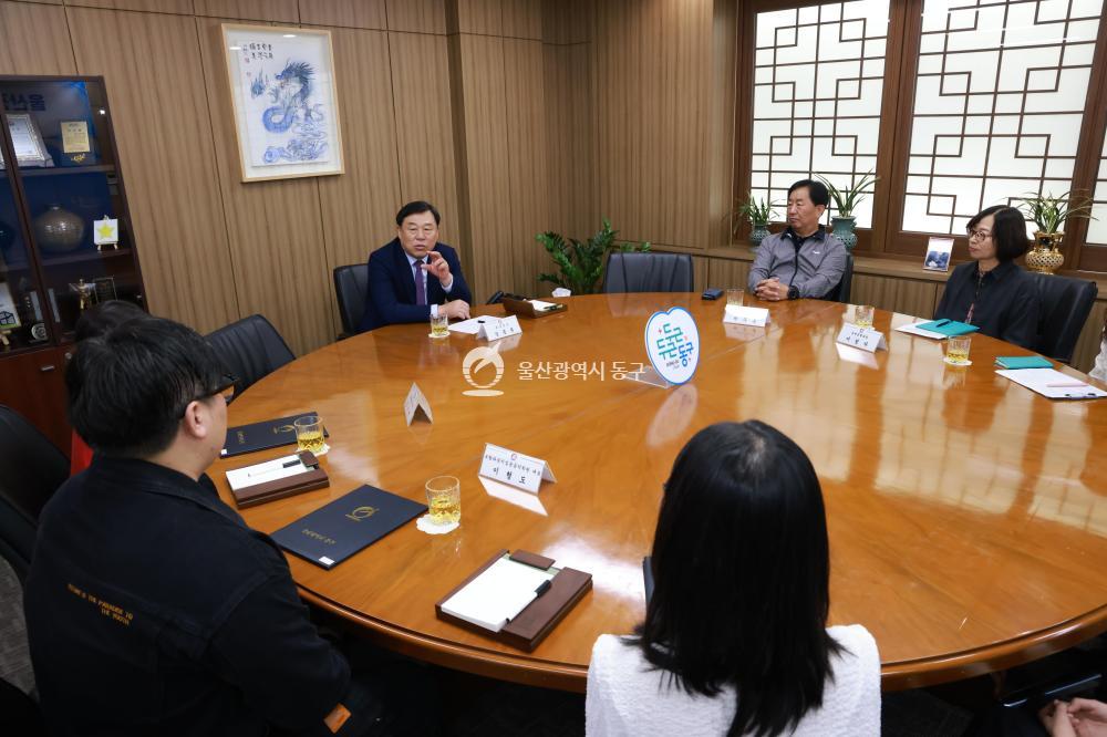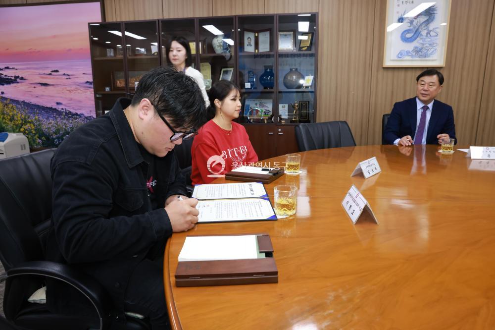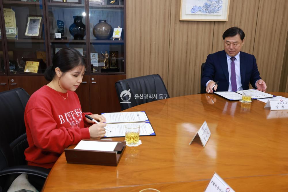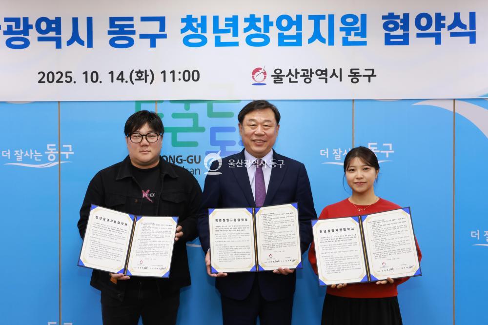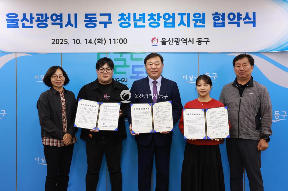 동구는 14일 구청장실에서 김종훈 동구청장과 청년창업자 모아라면땅 김보예 대표 및 보컬라운지 실용음악학원 이형도 대표가 참석해 창업지원 협약식을 체결하고 기념촬영을 하고 있다.