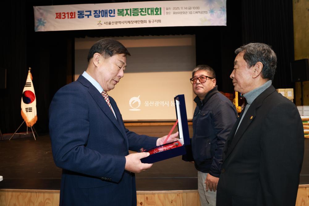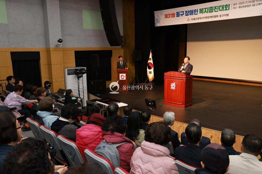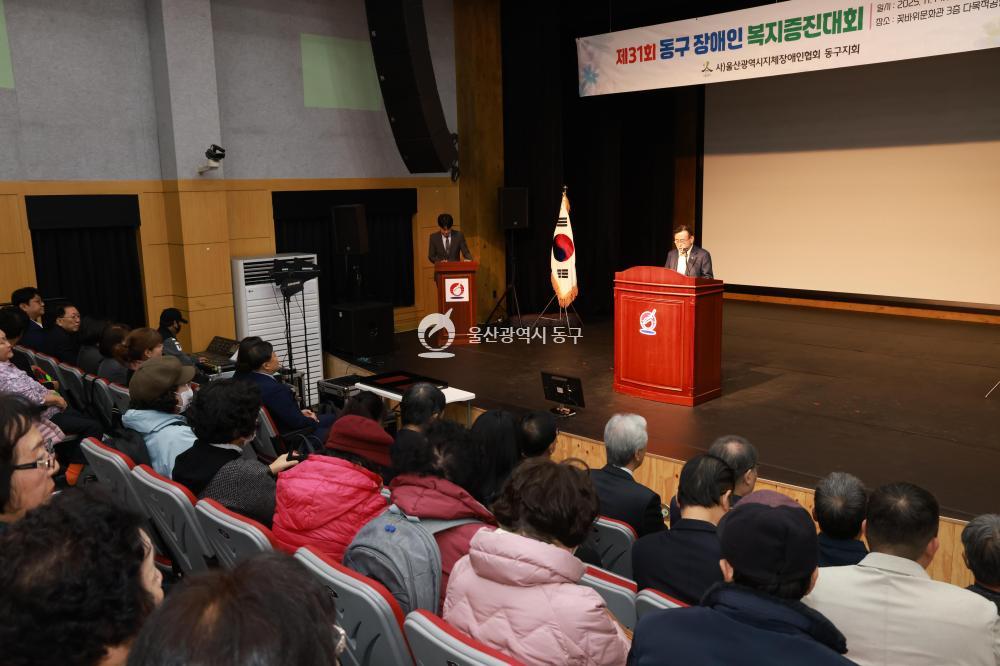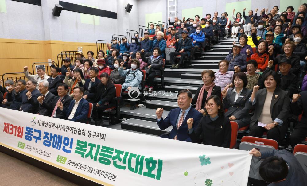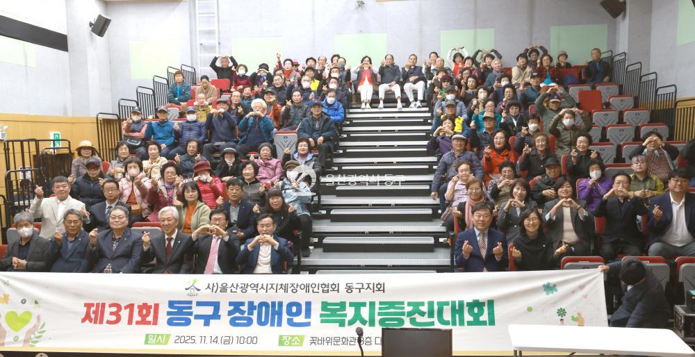 - 사진설명 울산 동구는 14일 꽃바위문화관에서 김종훈 동구청장과 내빈 및 장애인협회 회원 200여 명이 참석해 제31회 장애인 복지증진대회를 갖고 유공자 표창 수여 및 단체 기념촬영을 하고 있다.
