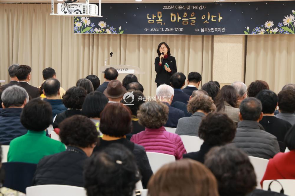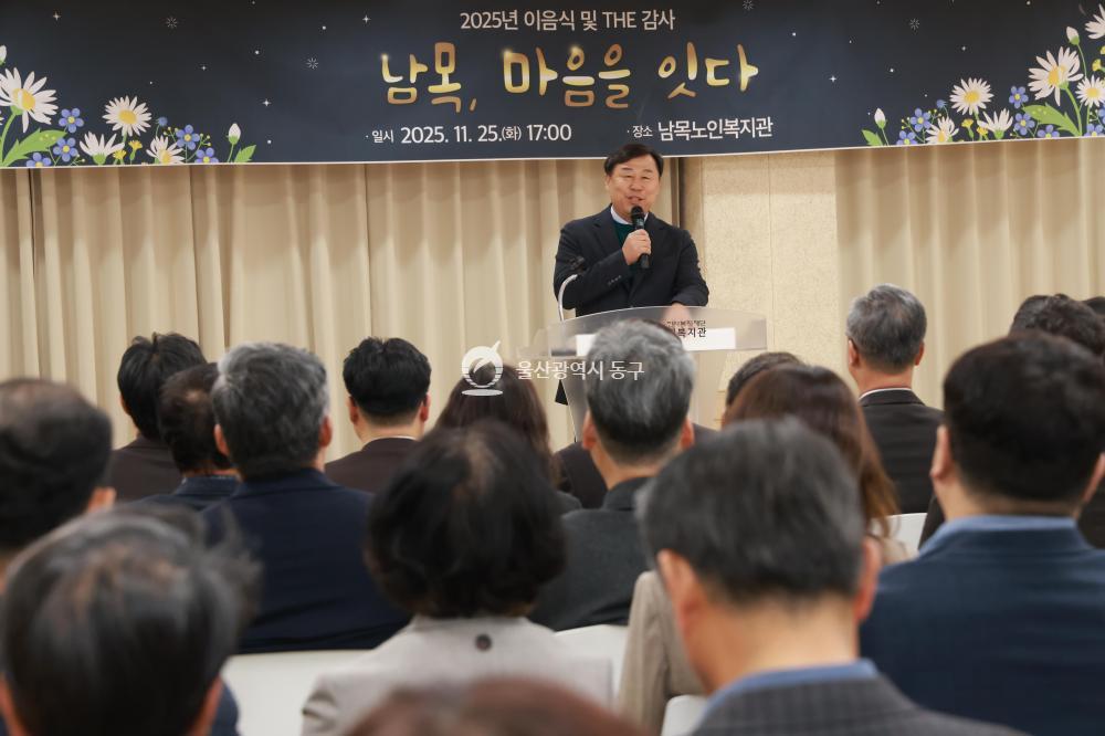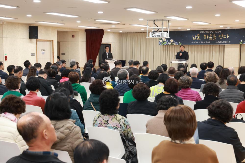 - 사진설명 김종훈 동구청장은 25일 남목노인복지관에서 가진 이음식 및 송년행사에 참석해 우수 자원봉사자 및 후원자 표창장 수여 및 단체 기념촬영을 하고 있다.
