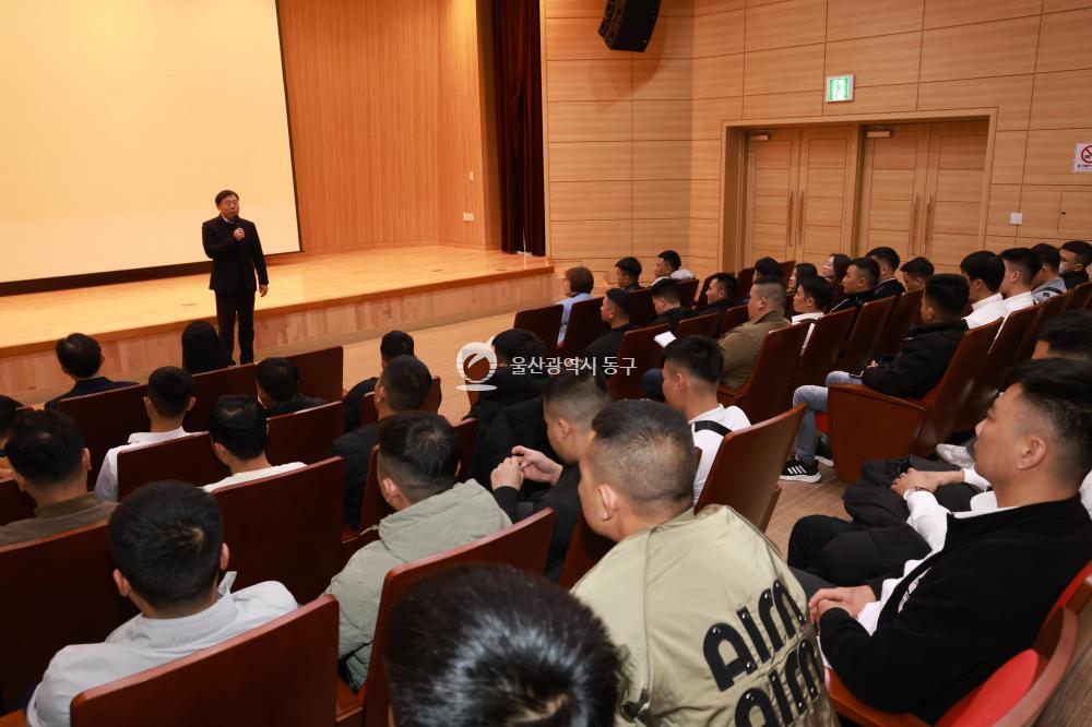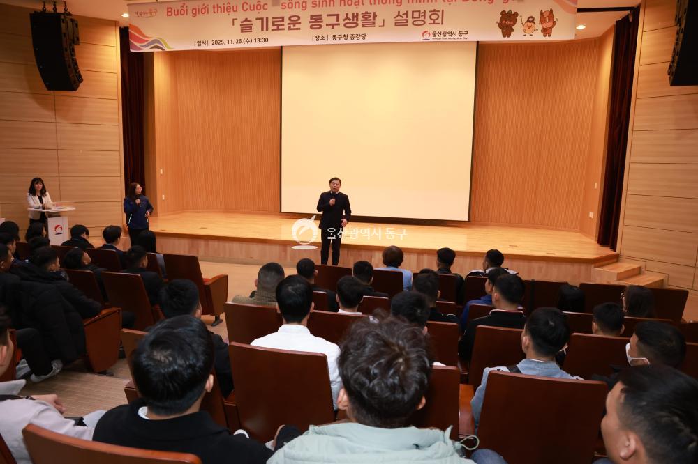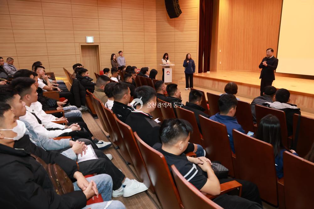 - 사진설명 울산 동구는 26일 5층 중강당에서 신규 입국한 베트남 출신 외국인 근로자 40명을 대상으로 슬기로운 동구생활 설명회를 갖고 김종훈 동구청장이 참석해 인사말 및 단체 기념촬영을 하고 있다.