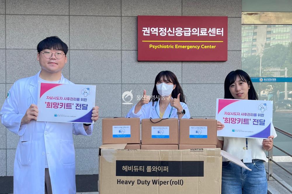 - 사진설명 동구정신건강복지센터(센터장 전진용)는 자살시도자의 재시도 예방과 심리적 안정을 지원하기 위해 9월 23일 울산대학교병원 생명사랑위기대응센터를 통해 ‘자살 시도자 사후관리 희망 키트’를 배포했다.