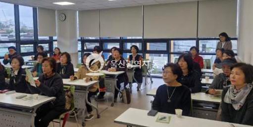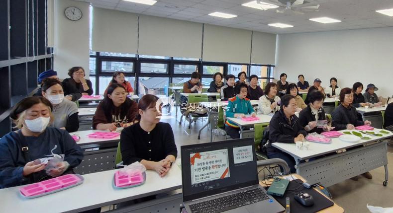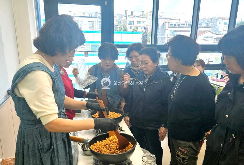 - 사진설명 울산 동구 화정동 통장회(회장 김영희)는 24일 회원 30여명이 동구가족센터를 방문해 강정만들기 프로그램 체험활동을 가졌다.